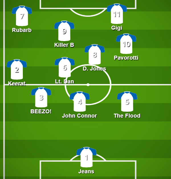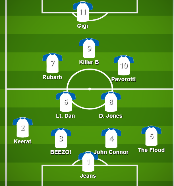 4-5-1 Narrow (4-2-3-1 narrow). Rubarb and Pavorotti jump out when ball transitions to their fullbacks. Lt. Dan stay as a true holding CDM in front of centerbacks and D. Jones move up to mark and connect. If Lt. Dan goes, D. Jones will hold.